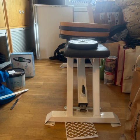 Allt är i bra skick, skivstången kan skruvas fast vilket rekommenderas ifall den ska användas för tyngre lyft då den riskerar att ramla baklänges annars.