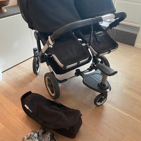 Bugaboo Donkey 5 Duo. Använd men i fint skick förutom en skada på ena suflettfästet (se bild, går att köpa som ny reservdel för 240 kr).