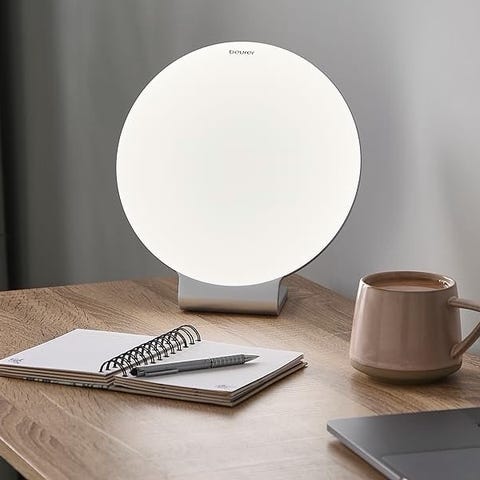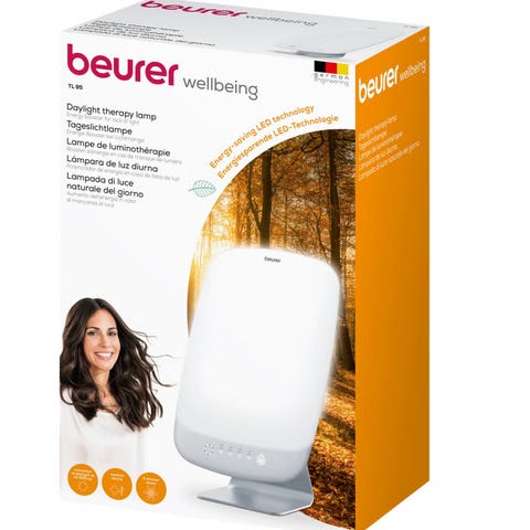 Beurer TL 50 ljusterapilampa i vit färg. Rund ljusyta monterad på fot med nätadapter och sladd. Produkten är avsedd för ljusterapi och kan användas inomhus, exempelvis på skrivbord eller bord. Bruksanvisning medföljer enligt bild.