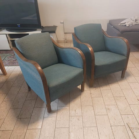 Två mycket fina art deco fåtöljer. Omklädda i nytt ”ulltyg”. Mått: bredd 75 cm, höjd 85 cm, djup 85 cm, sitthöjd 35 cm. Säljes som ett par, priset gäller för båda.