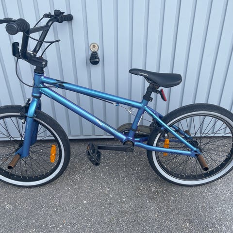 Scott barncykel med 20" hjul. Cykeln har ram i blå och orange färg, raka styren och sadel anpassad för barn. Utrustad med fot- och handbroms enligt bilderna samt grovmönstrade däck som passar för cykling på både asfalt och lättare grusunderlag. Lämplig för barn som vuxit ur mindre barncykelstorlekar och behöver 20" hjulstorlek. Nyligen bytta däck och sadel.