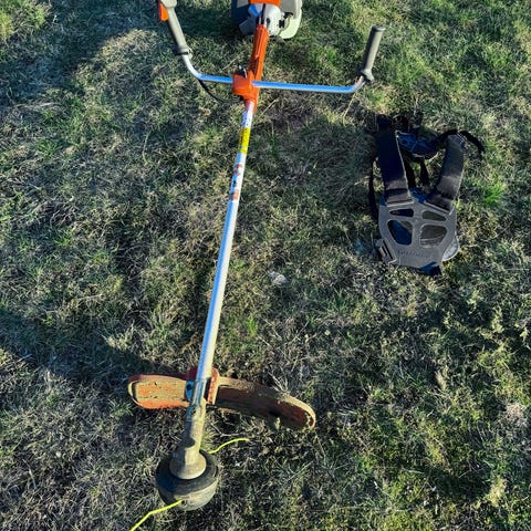 Nyskick, endast inkörd 1 tank. Medföljer alla originaltillbehör;trimmerhuvud, trekantsklinga, 1 extra röjklinga.