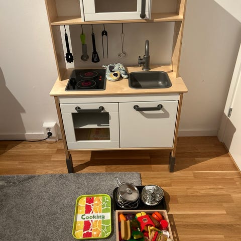 Säljer ett leksakskök i trä från Ikea. Perfekt för barn som gillar att leka restaurang eller laga mat. Köket har spishäll med ljus, diskho med kran, ugn, förvaring samt hyllor ovanför. Köket är i väldigt fint skick. För mått, se sista bilden. Nypris: 995kr.