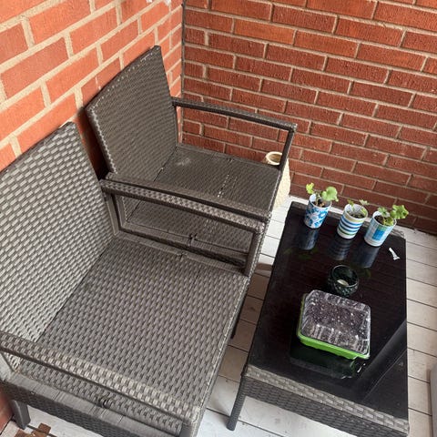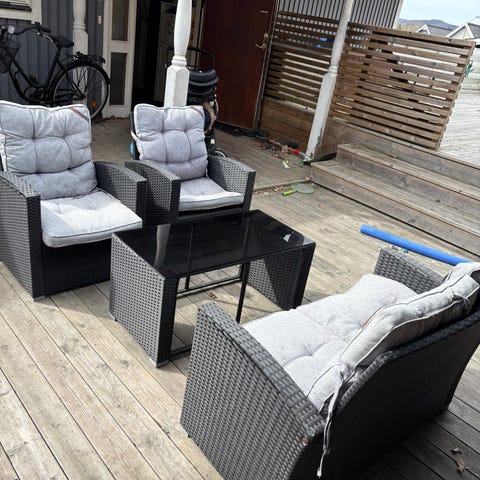 Loungeset med utemöbler i svart konstrotting. Setet består av fåtöljer och en soffa, samt ett lågt bord. Dynor i lila tyg ingår till sitt- och ryggdelar på flera av delarna. Möblerna är avsedda för utomhusbruk, till exempel altan, balkong eller uteplats. Konstruktionen är i flätad konstrotting med armstöd och raka linjer för sitt- och ryggdelar. Soffan och två fåtöljer har dynor, sedan finns det en fåtölj som är utan dyna. Säljer allting för 700 kr, ev kan priset diskuteras vid snabbaffär