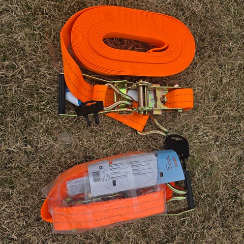 Grön draglina eller spännband. Lämplig för exempelvis säkring eller drag av föremål. Exakt längd, bredd, material och lastkapacitet är okända.