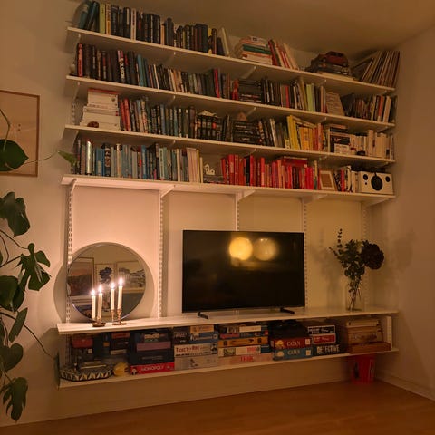 Hyllsystemet är monterat på vägg och ger plats för böcker, dekoration och förvaring. Den nedersta hyllan fungerar som ett djupare plan som kan användas som arbetsyta eller extra avlastningsyta. Passar i vardagsrum, sovrum eller arbetsrum där väggmonterad förvaring önskas.