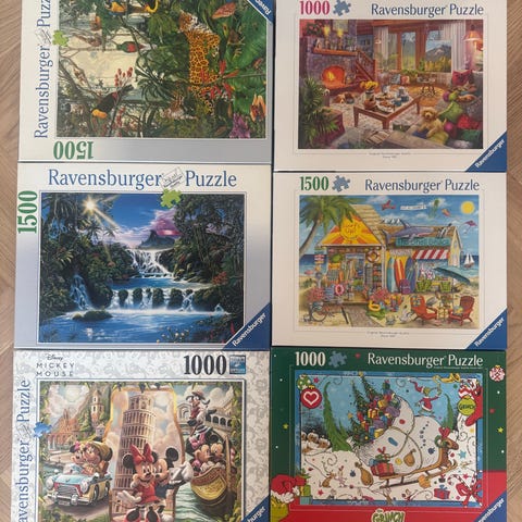 Schmidt pussel 1000 bitar med olika landskapsmotiv. Flerpack med sex olika pussel i originalkartonger. Motiven föreställer bland annat stadsmiljöer, broar, vatten och natur. Varje pussel består av 1000 bitar. Kartongerna kan ha visst slitage och en av kartongerna har släppt lite i kanten. Men alla bitar är räknade och finns där.