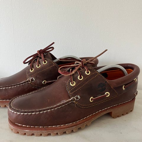 Timberland seglarskor i brun läder. Troligen storlek 43. Klassisk modell med snörning runt om och kontrastsömmar. Ovandel i läder och gummisula med låg profil. Innersula med perforering för ventilation. Passar som vardagssko eller för fritidsbruk.