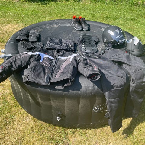 set med hjälm, jacka byxor handskar och stövlar