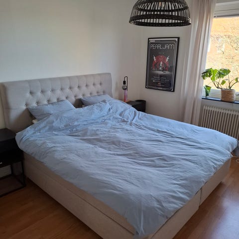 Kontinentalsäng från IKEA. 180 cm. Det finns fläckar på bäddmadrassen men madrasskyddet på den är avtagbart och går att tvätta.
