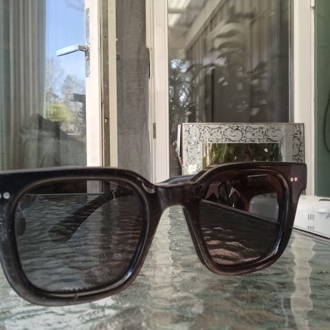 Chimi solglasögon unisex i svart färg. Modellen har kraftig, rektangulär båge i plast med mörka tonade glas. Passar både dam och herr. Levereras med hårt fodral enligt bild om detta ingår vid köp.