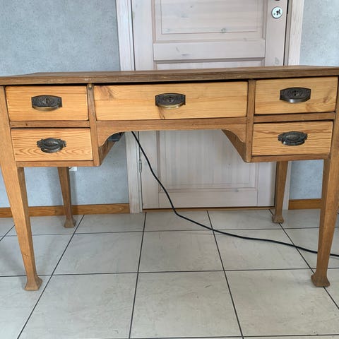 Skrivbord,furu 5 lådor.Svarvade ben med kopplad benkryss.