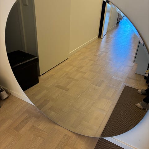 oval spegel i glas. Enkel väggspegel med tunn ram som passar i exempelvis hall, sovrum eller vardagsrum . Neutral design som fungerar i många olika inredningsstilar.