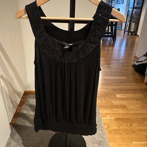 H&M linne för dam i storlek XS. Linnet är svart och tillverkat i viskos. Modellen är ärmlös med rund halsringning. Passar till vardag eller enklare festliga tillfällen och kan bäras både ensamt eller under kofta eller kavaj.