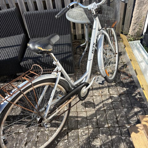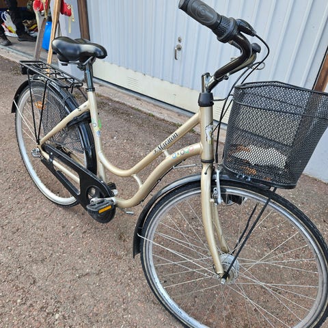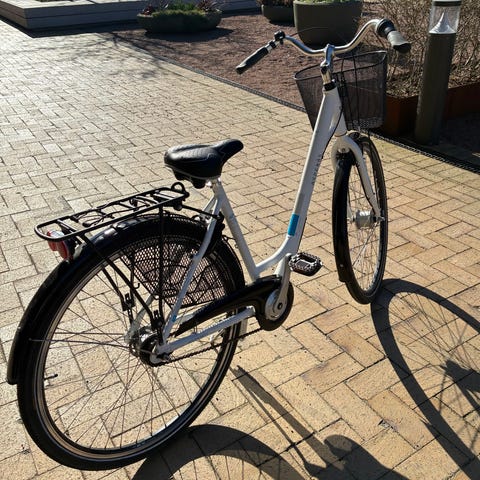 Monark vit 3 vxl cykel för dam med ramstorlek M och 28"-hjul. Cykeln har låg instegsram, framkorg, pakethållare bak samt skärmar fram och bak. Utrustad med