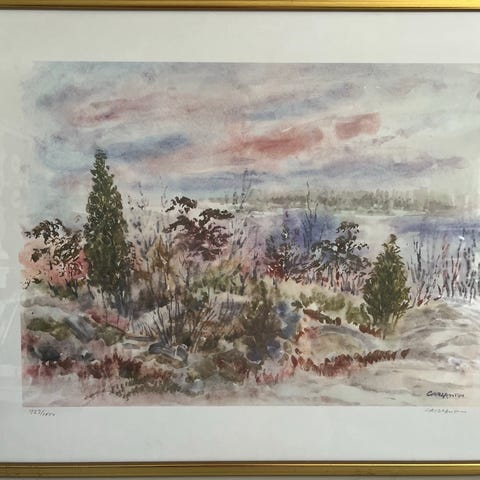 Ett grafiskt tryck föreställande ett vinterlandskap med en liten båt, skapat av den svenska konstnären Harald Wiberg