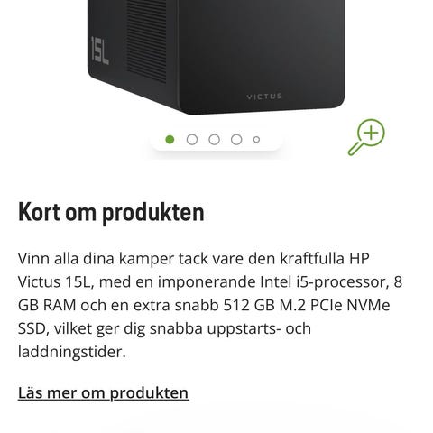 HP Victus 15L stationär dator med 13:e generationens Intel Core i5-13400F 10-kärnig processor, 8 GB DDR4 RAM-minne och 512 GB M.2 PCIe NVMe SSD-lagring. Datorn är avsedd för krävande användning som spel och tyngre program, med snabb uppstart och laddningstider tack vare SSD-enheten. Utrustningen lämpar sig för användning i hemmet eller på kontoret där det behövs en stationär dator med dedikerad prestanda för både arbete och underhållning.