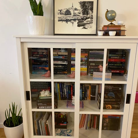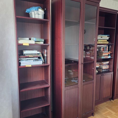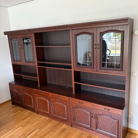 2 vitrinskåp med glasdörrar och integrerad belysning samt 3 underskåp/hyllor med tillhörande dörrar.