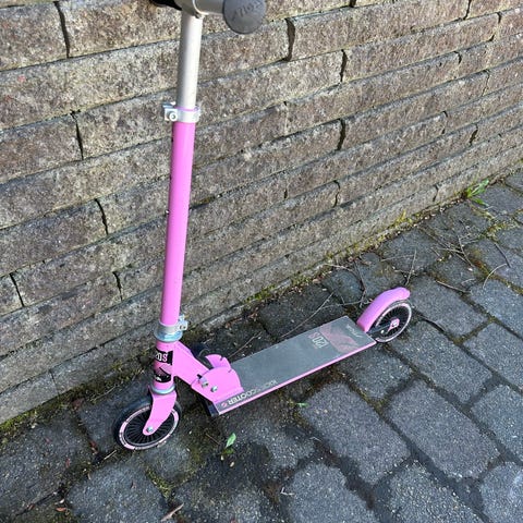 Rosa sparkcykel med justerbart styre och två hjul. Hopfällbar konstruktion med fotbroms på bakhjulet. Passar för barn 5-10 år. Väldigt fint skick!