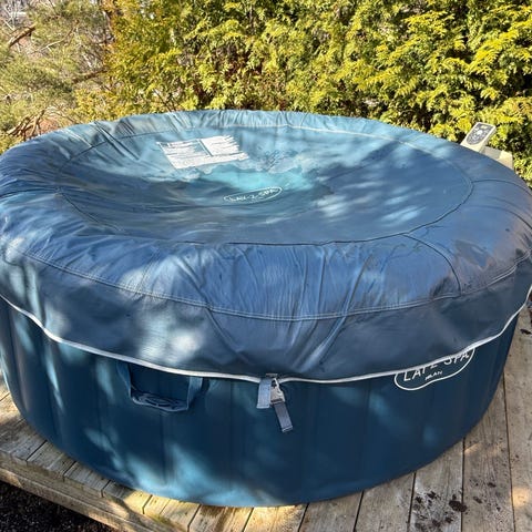 M-Spa M-011S uppblåsbar bubbelpool i svart utförande. Modellen är märkt "Inflatable Bubble Spa" och har integrerad kontrollenhet för styrning av funktioner. Poolen är avsedd för utomhusbruk på exempelvis altan eller uteplats och ansluts till elnätet enligt märkningen på enheten. Konstruktionen är uppblåsbar med vadderade väggar runt om för sittkomfort. Lämplig för privat bruk för avkopplande bad med bubbelmassage.