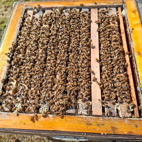 Bisamhälle Buckfast från 2025 övervintrade. 10 ramar ingår, ta med egen kupa. Pris 2650 kr med kupa 3750 kr.