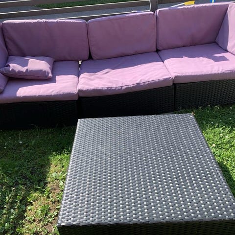Modulär soffgrupp / loungeset i svart konstrotting med mörkgråa sitt- och ryggdynor. Tyget är avtagbart och dynorna är hela. Tyget är solblekt. Konstrottingen är hel och i gott skick.