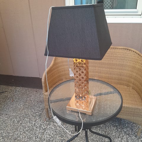 Lampan är i gott skick.. inget att klaga på.. grå och vit lampskärm.