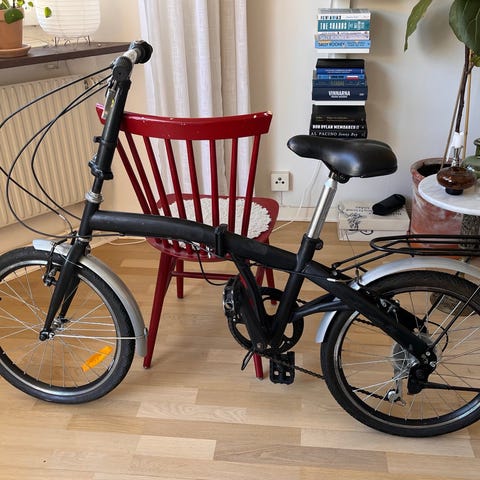 En blå fint skött vintage cykel som går att fälla ihop, stabil