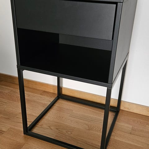Svartlackerat sängbord med svartlackerad stomme i metall. En utdragbar låda samt ett öppet fack undertill. Bordet går ej att nedmontera för t.ex. frakt.