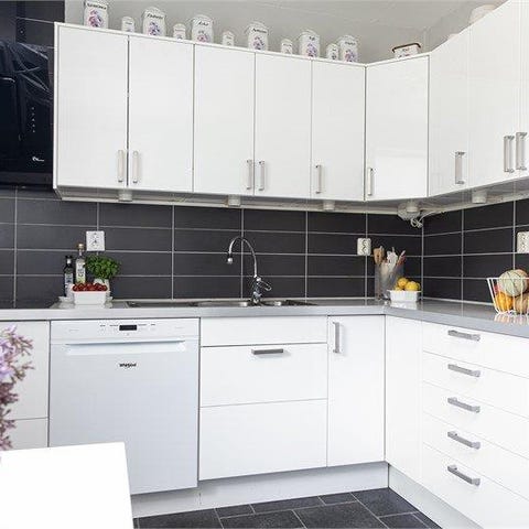 Köket är utrustat med rostfri diskho med blandare, diskmaskin i rostfritt samt ugn och spishäll. Ovanför spisen finns fläktkåpa.