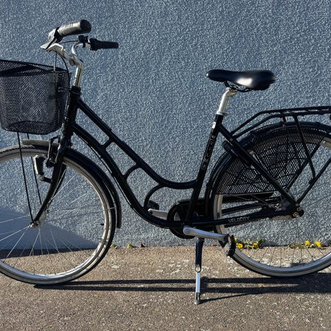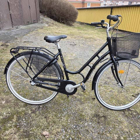 Damcykel från Sjösala Mariella med 28” tum hjul och lätt cyklade ram, ringklocka, pakethållare, ramlås m.m.