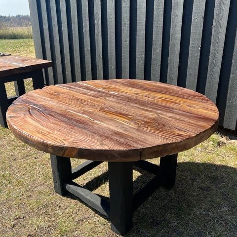 Bordet är tillverkat av återvunnet trä (reclaimed wood), vilket ger ett unikt utseende med naturliga variationer, märken och struktur. Varje exemplar är unikt.