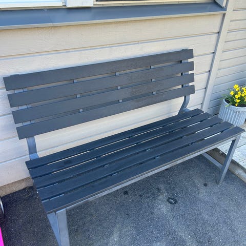 Äldre mycket charmig bänk med nya brädor i tätvuxen kärnfura. Brädorna är obehandlade för eget val av behandling. Gavlar i gjuten metall som är rengjorda och skrubbade med såpa.