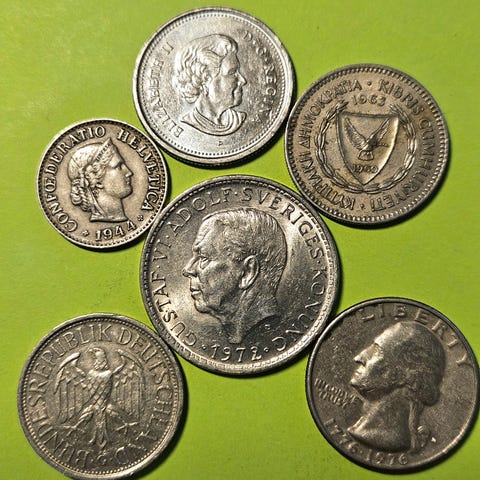 Samling grekiska mynt i metall, bestående av flera valörer drachmer och lepta. Motiven visar bland annat porträtt av historiska personer, statsvapen och atom-symbol. Mynten har text på grekiska och är präglade i olika storlekar. Lämpliga för den som samlar på utländska mynt eller är intresserad av grekisk numismatik.