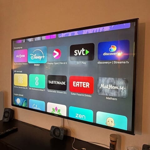 Samsung TV. Platt väggmonterad TV med svart ram. Lämplig för vardagsrum eller sovrum för visning av TV-program, film och annan media via anslutna enheter eller inbyggda appar, beroende på modellens funktioner.