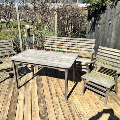 Trädgårdsmöbler i trä bestående av ett rektangulärt bord, en soffa och två stolar. Möbelgruppen är avsedd för utomhusbruk, till exempel i trädgård eller på altan. Bordet har fyrkantiga ben och plankskiva. Soffan och stolarna har ribbade sitsar och ryggstöd. Passar för sittgrupp utomhus för flera personer. Stor behöver skruvas åt, är rangliga. Hämtas snarast.