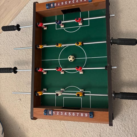 Bordfotboll spel i trä med grön spelplan och två lag med spelare i olika färger..