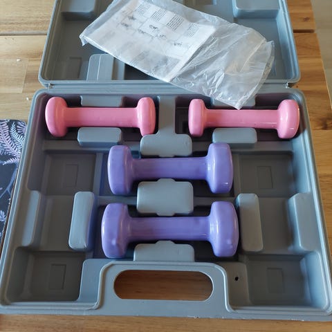 Set med olika hantlar och kettlebells för styrketräning. Innehåller bland annat hexhantlar med gummibeläggning, skivhantlar med viktskivor samt kettlebells i flera vikter och färger. Även handtag och draghandtag för kabelmaskin eller liknande ingår. Utrustningen lämpar sig för hemmagym eller mindre träningsyta och kan användas för helkroppsträning, exempelvis styrka, kondition och funktionell träning.