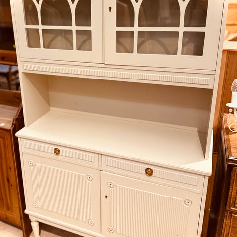 Ommålad skänk i gustaviansk stil. Färgen har en varm ljusbeige ton. Har använts som tv-skåp, så det finns ett utborrat hål på skivan mot väggen där sladdar gått igenom. (Se sista bilden)