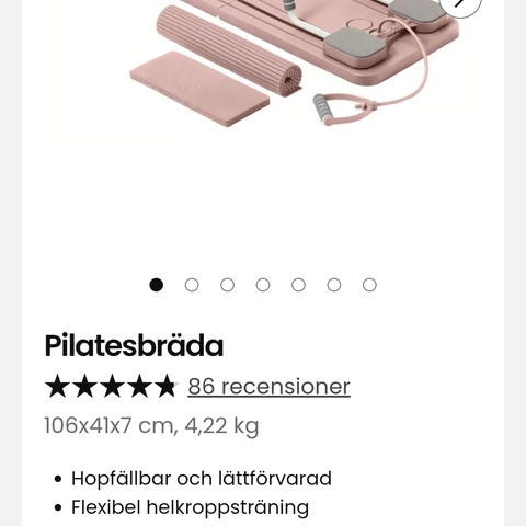 Paket med träningsutrustning för hemmabruk. Innehåller ett mindre löpband, en vibrations- eller balansplatta, en rosa pilatesboll, en pilatesring, en rund balansdyna samt en sittande träningsbänk. Utrustningen lämpar sig för enklare konditionsträning, styrketräning och balans- och rörlighetsövningar i hemmet. Alla delar är fristående och kan användas var för sig beroende på träningsbehov.
