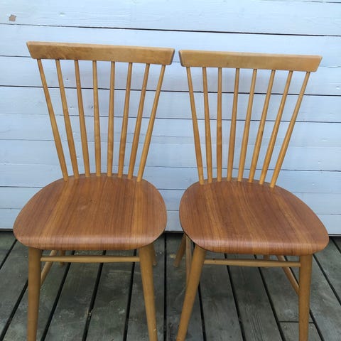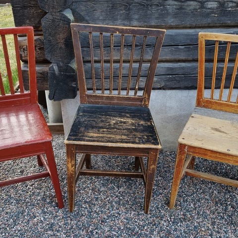 Fina retro svensktillverkade pinnstolar 1960-70 tal Stolarna är hela och stabila. Patina i färgen finns så klart efter tidens tand.