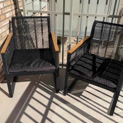 Balkongmöbelset bestående av två stolar och ett runt bord. Stolarna har sits och rygg i brun konstrotting med svarta metallben samt mörka sittdynor. Bordet har skiva i glas med underdel i matchande konstrotting och svarta ben. Passar för användning på balkong, uteplats eller altan.
