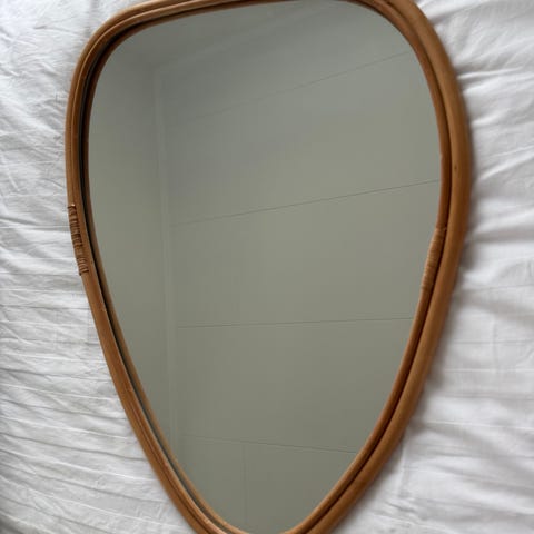 FRÖSEKE NYBRO spegel med träram. Spegeln har en mjukt rundad, rektangulär form med bred ram i K A L K A D EK och spegelglas i mitten.