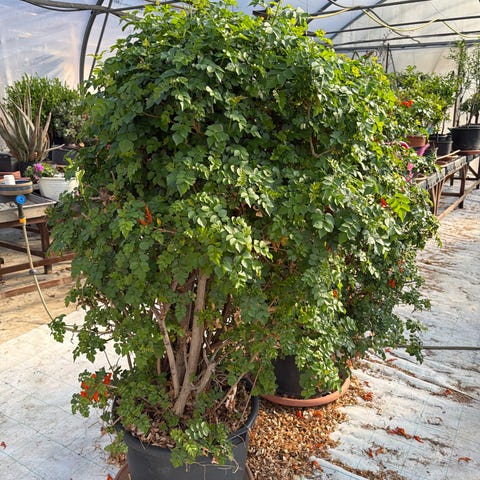 Blå potatisbuske som krukväxt med lila blommor. Växten står i plastkruka med fat och har buskigt växtsätt med gröna blad och små lila blommor med gul mitt. Passar som prydnadsväxt i kruka på uteplats, balkong eller i växthus under den varmare delen av året, samt ljust inomhus under svalare perioder. Ca 80 cm hög.