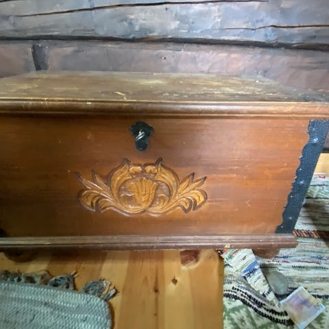 Trälåda för förvaring i vitmålat trä med mörka metallbeslag. Lådan har gångjärn och låsbeslag på framsidan. Passar som förvaringskista i vardagsrum, sovrum eller hall, till exempel för textilier, leksaker eller annan förvaring. Står direkt på golvet med markerad sockel runt om.