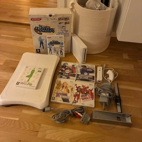 Nintendo Wii spelpaket med flera spel och tillbehör. Paketet innehåller Wii Balance Board med spelet Wii Fit Plus samt spelet Wii Sports. Flera musik- och karaokespel ur serien We Sing, inklusive We Sing Rock och We Sing Encore, med tillhörande 2 mikrofoner. Disney Infinity med figurer och spelbricka. Dessutom familje- och barnspel som The Smurfs Dance Party och spel ur serien Reader rabbit. Allt för 300kr.