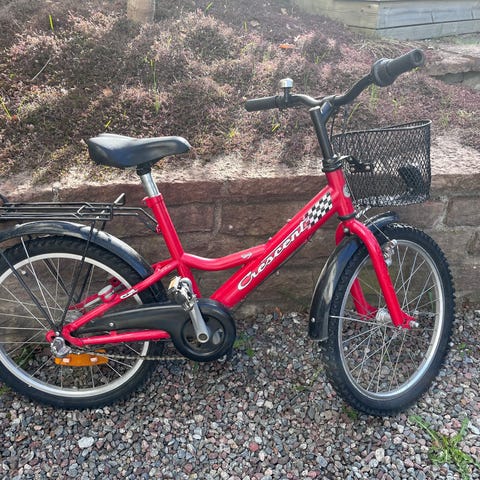 Barncykel med 16" hjul i blå färg. Utrustad med korg fram och pakethållare bak. Cykeln har fotbroms bak och handbroms fram. Passar mindre barn som behöver en cykel i 16-tumsstorlek för vardagscykling och lek. Kedjeskydd bör monteras. Cykelkorg lite bucklig.