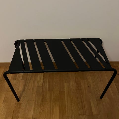 String hylla formgiven av Nils Strinning. Överdel i trä med rektangulär form och rundade hörn, underdel i svartlackerad metall med ribbor som fungerar som förvaring eller avlastningsyta. Hyllan monteras på vägg och kan användas i hall, vardagsrum, sovrum eller kök för förvaring av till exempel böcker, tidningar, skor eller mindre föremål. Ursprungligen var den menat som telefonhylla, att ha telefonen på.