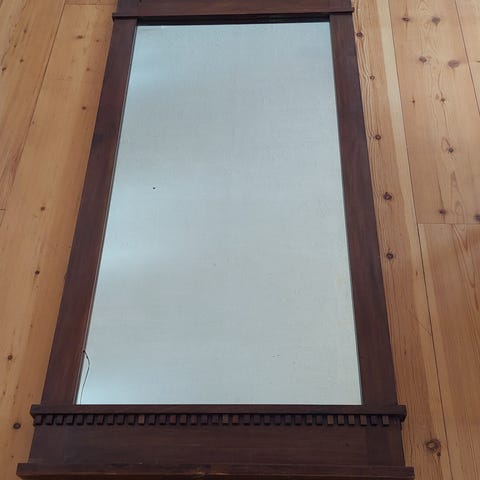 Spegel i fönsterformat med brunbetsad ram. Höjd 75 cm, bredd 50 cm.