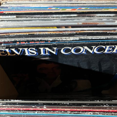 Samling med cirka 35 LP-skivor av blandade artister. På bilderna syns bland annat album från Metal Hammer, Supertramp, Björn Afzelius & Globetrotters samt Whitney Houston.